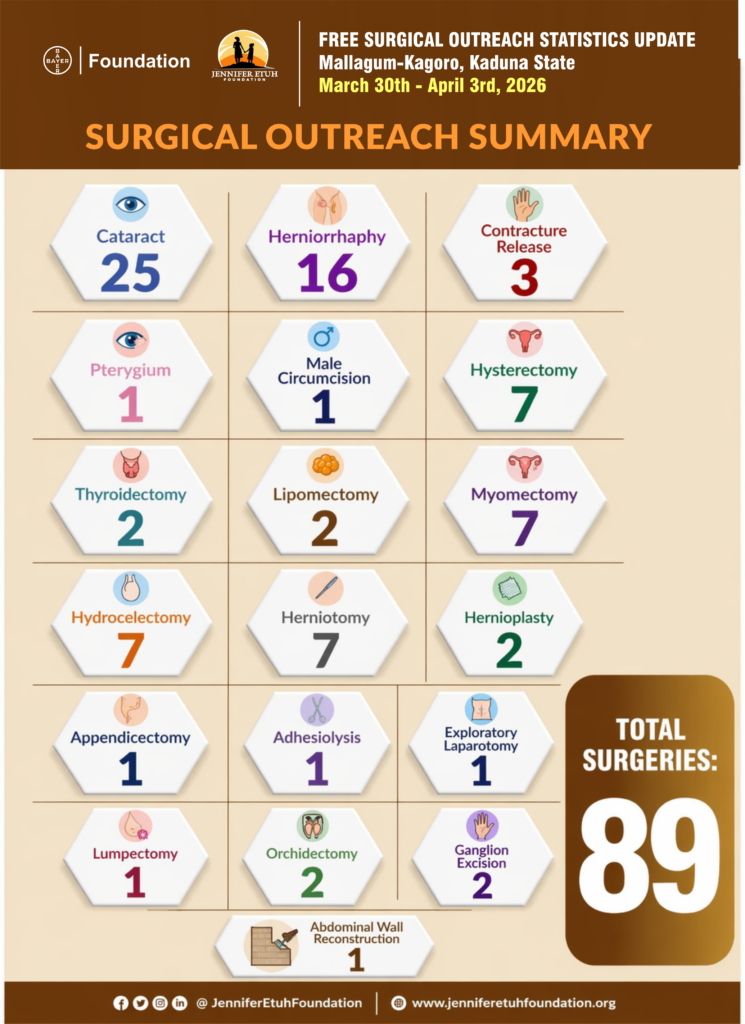 When the doors opened at the Jennifer Etuh Specialist Hospital in Mallagum-Kagoro, from March 30th to April 3rd, 2026, restoration in its purest form began to take place in the operating rooms. That kind of quiet miracle that happens in surgery when steady hands, focused minds, and committed hearts that understand what’s at stake work tirelessly to ensure that each patient is given a second and better chance to life. 5 days and 89 procedures later, scores of beneficiaries witnessed turning points in various ways: from vision that was restored, to long-standing pain and bleeding being reversed, to contractures that were released, each patient became a walking miracle.